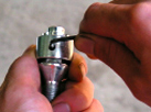 2-B 万力を使って圧入 アドロックキャップとボルトの六角の位置を合わせ万力にセットし、万力を締込みしっかり圧入します。 ※本体を少しずつ回転させ締めて頂くと、まっすぐ圧入が出来ます。 | ||