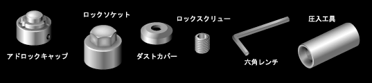 ■補修部品価格 ロックソケット(1個)・・・・・OPEN価格 ダストカバー(1個)・・・・・OPEN価格 アドロックキャップ(1個)・・・・・OPEN価格 ロックスクリューセット・・・・・OPEN価格 圧入工具(1個)・・・・・OPEN価格 |